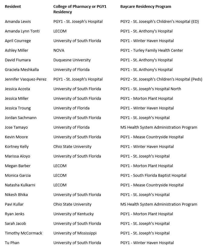 BayCare Health System is excited to welcome 24 new residents to our ranks. The 2019-2020 residency year brings nineteen PGY1 residents, one PGY2 ED resident, one PGY2 Pediatrics resident and two PGY1/PGY2 Master’s of Science in Pharmaceutical Sciences with specialization in Health-System Pharmacy Administration residents.